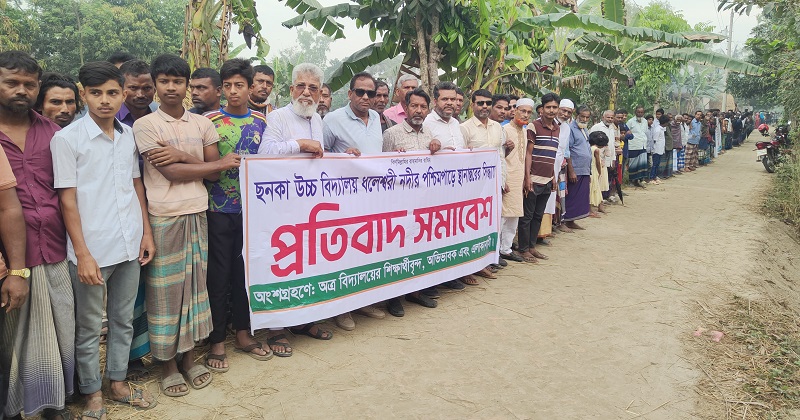 মানিকগঞ্জের সাটুরিয়া উপজেলার ছনকা উচ্চ বিদ্যালয় ধলেশ্বরী নদীর পূর্ব পাশ থেকে স্থানান্তর করে পশ্চিম পাশে না নেওয়ার প্রতিবাদে সভা ও মানববন্ধন অনুষ্ঠিত হয়েছে।