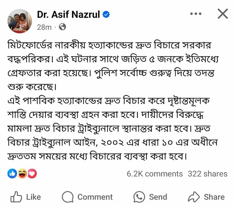 ফেসবুক পোস্টে আসিফ নজরুল বলেন, ‘মিটফোর্ডের নারকীয় হত্যাকাণ্ডের দ্রুত বিচারে সরকার বদ্ধপরিকর। এই ঘটনার সঙ্গে জড়িত ৫ জনকে ইতোমধ্যে গ্রেফতার করা হয়েছে। পুলিশ সর্বোচ্চ গুরুত্ব দিয়ে তদন্ত শুরু করেছে।