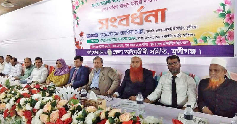 মুন্সিগঞ্জে নবনিযুক্ত সিনিয়র জেলা ও দায়রা জজ ফারুক আহমেদ ও চীফ জুডিসিয়াল ম্যাজিস্ট্রেট সাব্বির মাহমুদ চৌধুরীকে সংবর্ধনা দিয়েছেন জেলা আইনজীবী সমিতির সদস্যরা।
