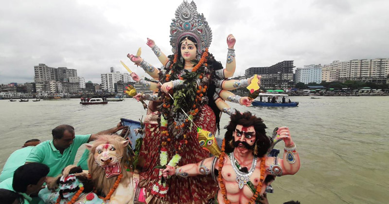 বিকেল থেকে ঢাকের বাদ্য আর গান-বাজনা ছাড়া বিদায়ের করুণ ছায়ায় সারিবদ্ধভাবে একে একে বুড়িগঙ্গা নদীতে বিসর্জন দেয়া হয় প্রতিমা। একই সময়ে তুরাগ নদীতে চলে বিসর্জন। সড়কে পুলিশের টহল ও নদীতে ছিল নৌপুলিশের টহল। ফায়ার সার্ভিসের টিমও দায়িত্ব পালন করে।