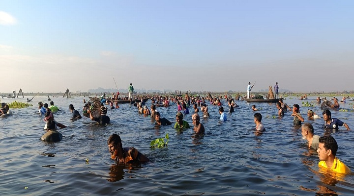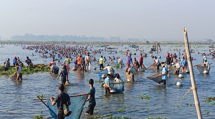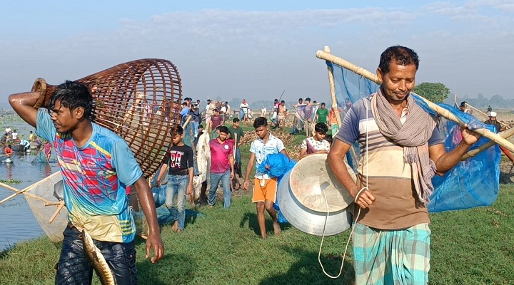 শনিবার (৩০ নভেম্বর) ভোরে এমন দৃশ্য চোখে পড়ে পাবনার ভাঙ্গুড়া উপজেলার রুহুল বিলে। দল বেঁধে বিলে নেমে মনের আনন্দে মাছ শিকার শুরু করেন শিকারিরা। কেউ পাচ্ছেন বোয়াল, কেউ বা শোল, রুই, কাতল। অনেকে ফিরছেন খালি হাতে। এভাবেই চলনবিলে মাছ শিকারে মেতেছেন সৌখিন মৎস্য শিকারিরা।