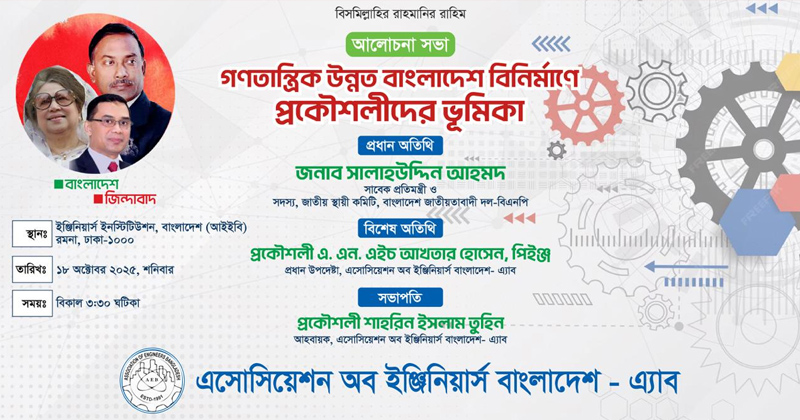 গণতান্ত্রিক উন্নত বাংলাদেশ বিনির্মাণে প্রকৌশলীদের ভূমিকা নিয়ে এসোসিয়েশন অব ইঞ্জিনিয়ার্স বাংলাদেশের (এ্যাব) উদ্যোগে আগামী শনিবার আলোচনা সভা অনুষ্ঠিত হবে।