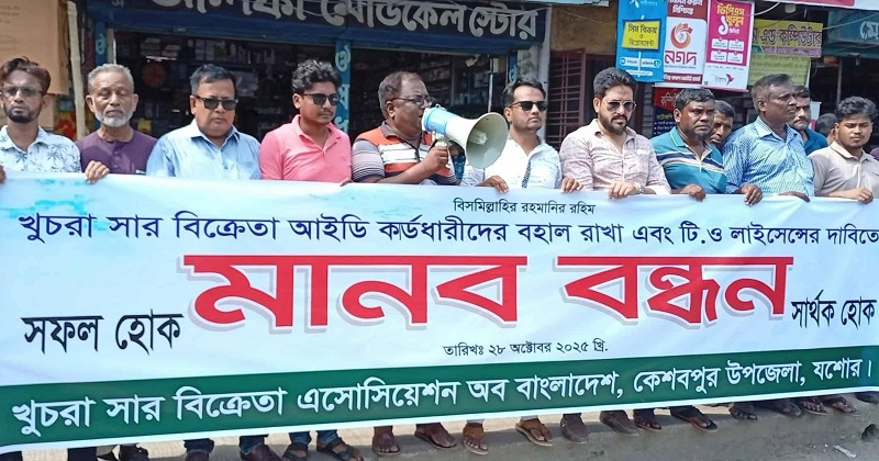 মঙ্গলবার (২৮ অক্টোবর) দুপুরে কেশবপুর ত্রিমোহীনি মোড় চত্বরে কেশবপুর খুচর সার বিক্রেতা এসোসিয়েশন অব বাংলাদেশ শাখার উদ্যোগে মানববন্ধন কর্মসূচি পালন ও উপজেলা কৃষি কর্মকর্তার মাধ্যমে প্রধান উপদেষ্টা বরাবর স্মারকলিপি প্রদান করেছেন।