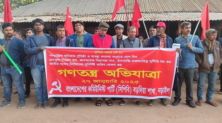 দ্রব্যমূল্যের নিয়ন্ত্রণ, জানমালের নিরাপত্তা, চাঁদাবাজি-দখলদারিত্ব-দুর্নীতি বন্ধ ও জাতীয় সংসদ নির্বাচনের সুনির্দিষ্ট তারিখ ঘোষণার দাবিতে নড়াইলের কালিয়ায় ‘গণতন্ত্র অভিযাত্রা’ কর্মসূচি পালন করেছে বাংলাদেশ কমিউনিস্ট পার্টি (সিপিবি)।