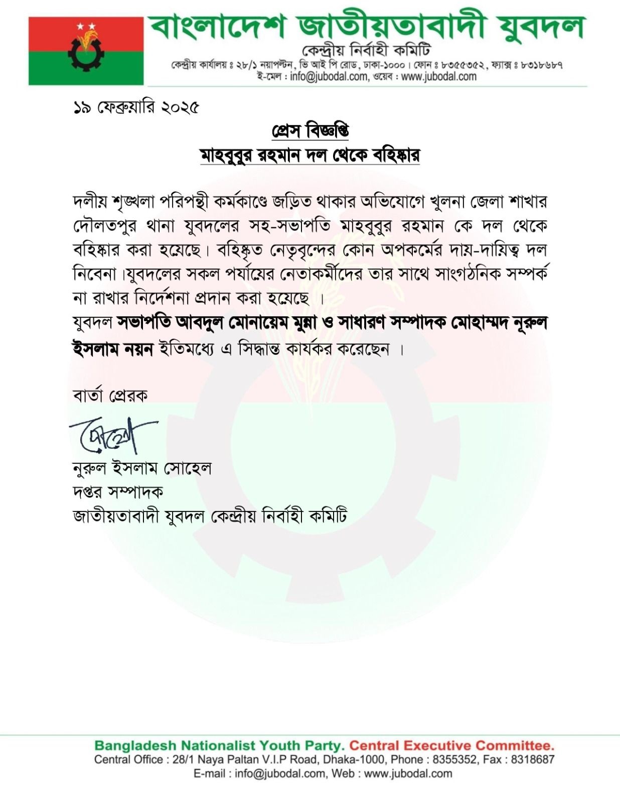 বিজ্ঞপ্তিতে উল্লেখ করা হয়, দলীয় শৃঙ্খলা পরিপন্থি কর্মকাণ্ডে জড়িত থাকার অভিযোগে দৌলতপুর থানা যুবদলের সহ-সভাপতি মাহবুবুর রহমানকে দল থেকে বহিষ্কার করা হয়েছে। বহিষ্কৃত নেতৃবৃন্দের কোনো অপকর্মের দায়দায়িত্ব দল নেবে না। যুবদলের সকল পর্যায়ের নেতাকর্মীদের তার সঙ্গে সাংগঠনিক সম্পর্ক না রাখার নির্দেশনা প্রদান করা হয়েছে।