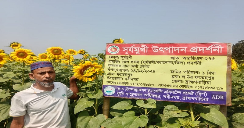 নবীনগর উপজেলার শিবপুর, লাউরফতেহপুর, শ্রীরামপুর ইউনিয়নসহ বিভিন্ন এলাকায় প্রায় ৫০ বিঘা জমিতে আরডিএস ২৭৫ জাতের সূর্যমুখী চাষ করা হয়েছে। কৃষি বিভাগের সার্বিক তত্বাবধানে সরকারের ফ্লাড রিকনস্ট্রাকশন ইমারজেন্সি অ্যাসিসট্যান্স প্রজেক্টের (ফ্রীপ) অর্থায়নে চাষীদের উদ্বুদ্ধ করতে বিনামূল্যে সরবরাহ করা হয়েছে সার, বীজ ও নগদ অর্থ।