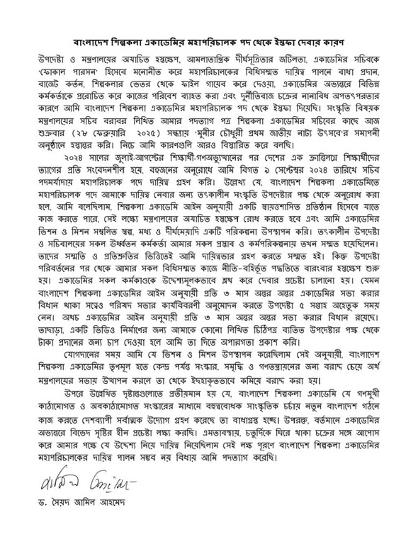 লিখিত বক্তব্যে সৈয়দ জামিল আহমেদ বলেন, উপদেষ্টা ও মন্ত্রণালয়ের অযাচিত হস্তক্ষেপ, আমলাতান্ত্রিক দীর্ঘসূত্রতার জটিলতা, একাডেমির সচিবকে ফোকাল পারসন হিসেবে মনোনীত করে মহাপরিচালকের বিধিসম্মত দায়িত্ব পালনে বাধা প্রদান, বাজেট কর্তন, শিল্পকলার ভেতর থেকে ফাইল গায়েব করে দেওয়া, একাডেমির অভ্যন্তরে বিভিন্ন কর্মকর্তাকে প্ররোচিত করে কাজের পরিবেশ ব্যাহত করা এবং দুর্নীতিবাজ চক্রের নানা অপতৎপরতার কারণে আমি বাংলাদেশ শিল্পকলা একাডেমির মহাপরিচালক পদ থেকে ইস্তফা দিয়েছি।