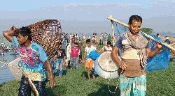 বাঞ্ছারামপুরে তিতাস নদীতে বেড়া দিয়ে মাছ শিকার